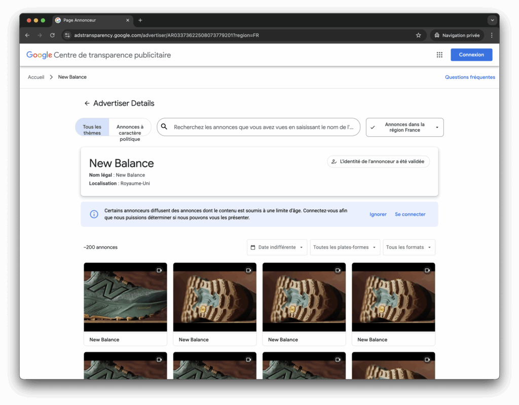 La Google Ads Library, ou Google Ads Transparency Center, offre une vision complète des publicités diffusées sur l’écosystème Google : Search, YouTube, Display, Discover ou encore Gmail. En recherchant une marque ou un domaine, vous pouvez accéder à toutes les publicités actives d’un annonceur, quel que soit le canal utilisé.