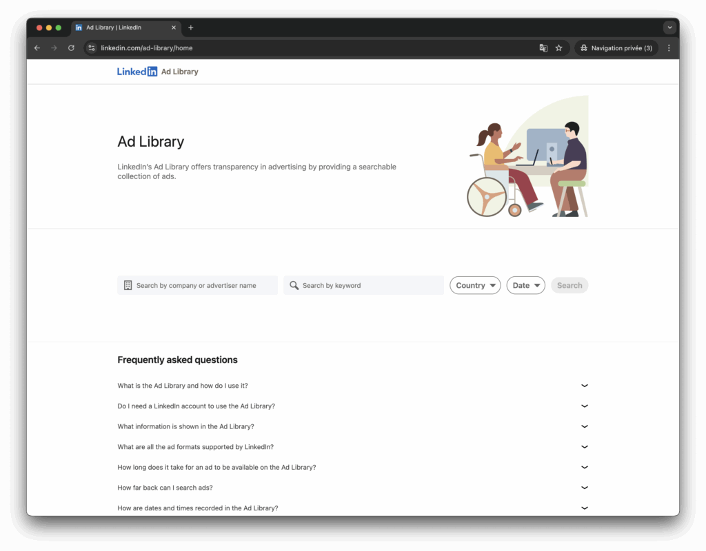 La LinkedIn Ads Library est l’outil de transparence publicitaire de LinkedIn, principalement conçu pour rendre visibles les publicités liées aux sujets politiques, électoraux ou sociétaux.