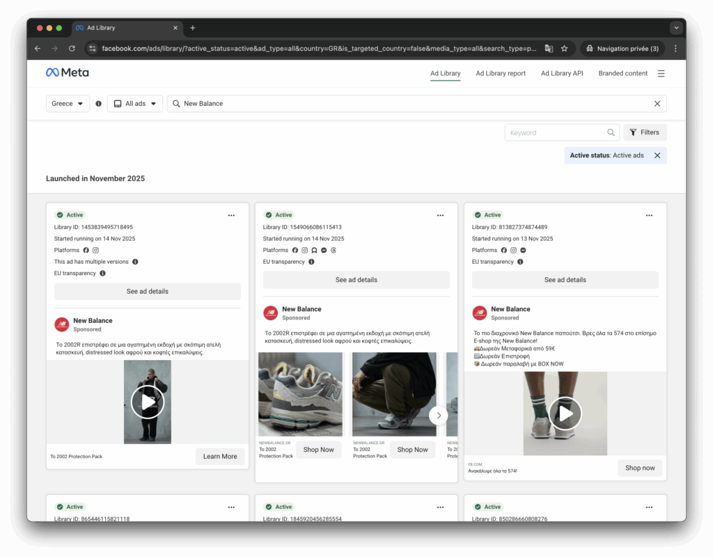 - Les publicités actives d’un annonceur donné (via recherche par nom de marque ou domaine).