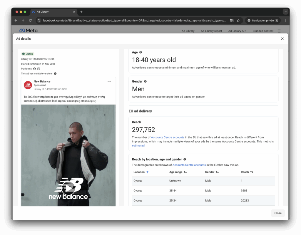 En revanche, la Meta Ad Library ne fournit aucune donnée de performance — vous ne verrez donc pas les taux de clics, de conversion ou les coûts par acquisition. Elle ne donne pas non plus accès aux détails du ciblage (intérêts, comportements ou segments d’audience).