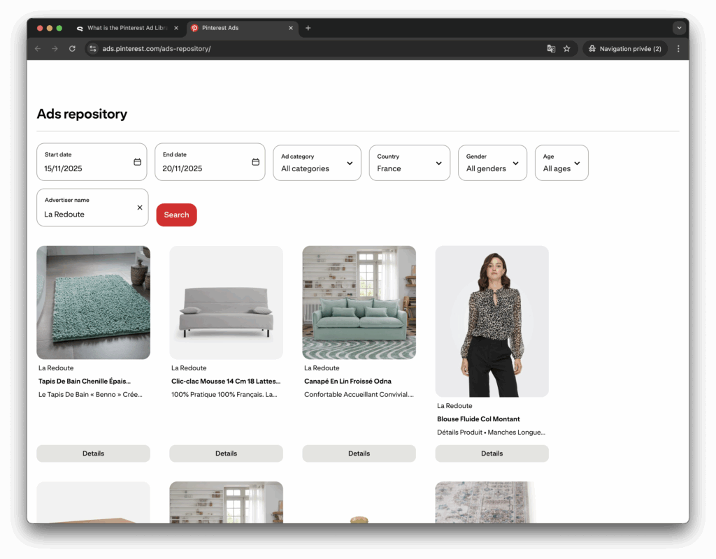 La Pinterest Ads Repository est la bibliothèque officielle de Pinterest qui permet d’accéder à une vaste collection de publicités diffusées sur la plateforme.