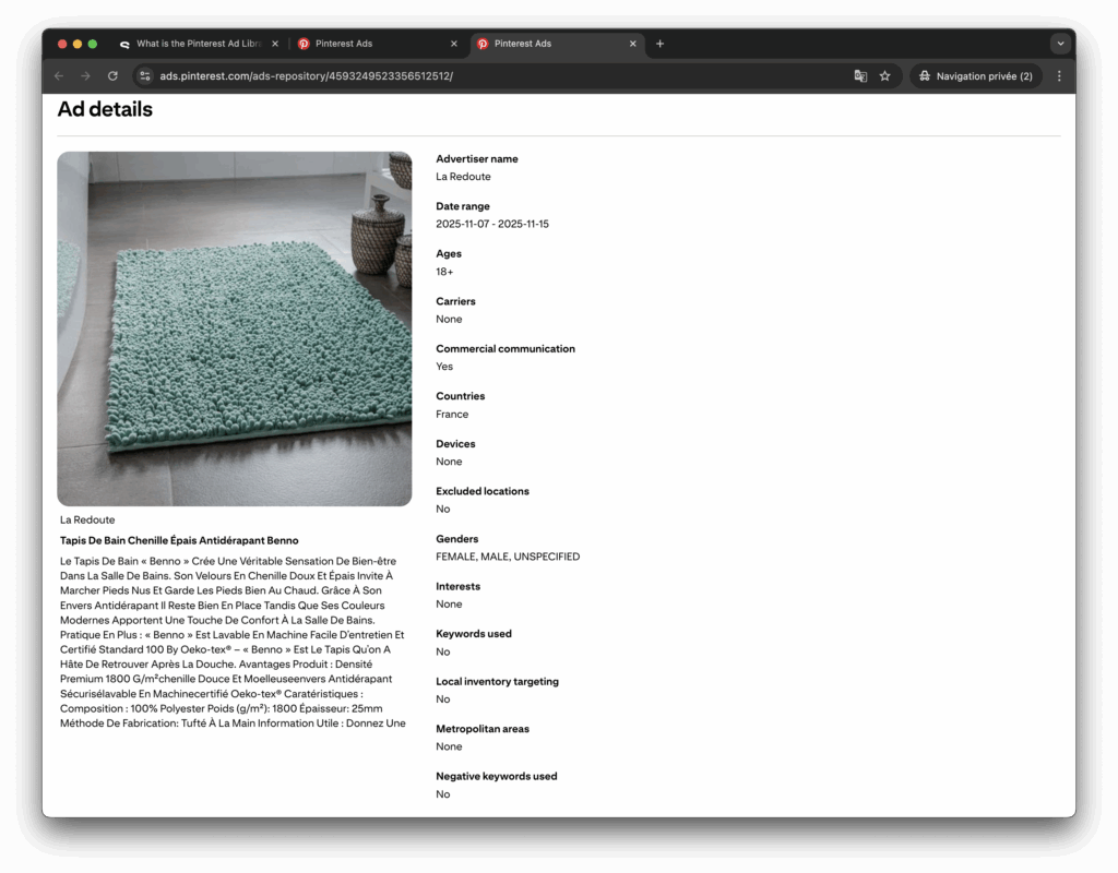 Même sans accès complet aux performances ou au ciblage précis, l’outil permet de tirer des insights précieux sur les codes du visuel publicitaire et la structuration créative sur Pinterest.